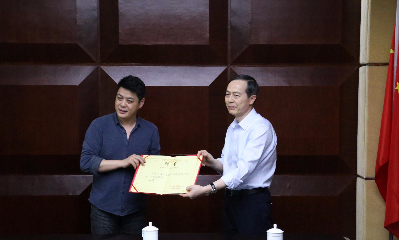 4月22日,省委宣傳部原常務副部長胡堅、中央美術學院吳永平教授、西湖大學堂秘書長王偉等一行蒞臨集團公司,與集團公司黨委書記、總經理虞岳明,副總經理吳敏,藝創公司董事長陳巖等圍繞共同推進集團公司文化產業領域的合作發展進行了深入交流。虞岳明為吳永平教授頒發了浙江省工藝美術研究院院長的聘任書。
