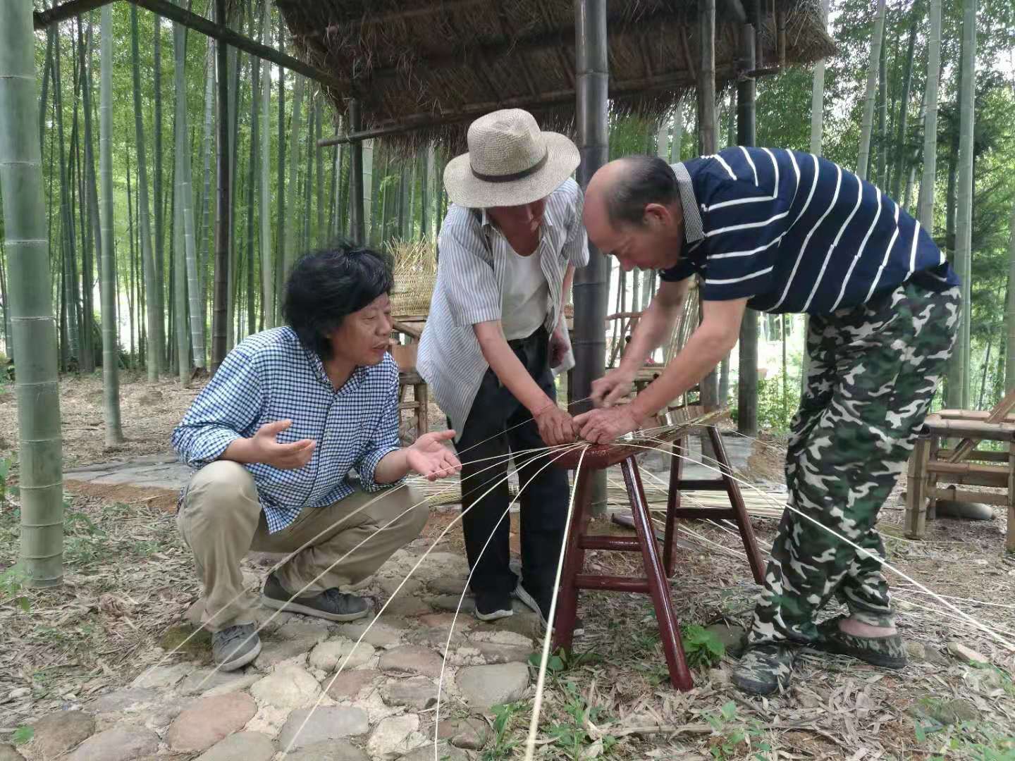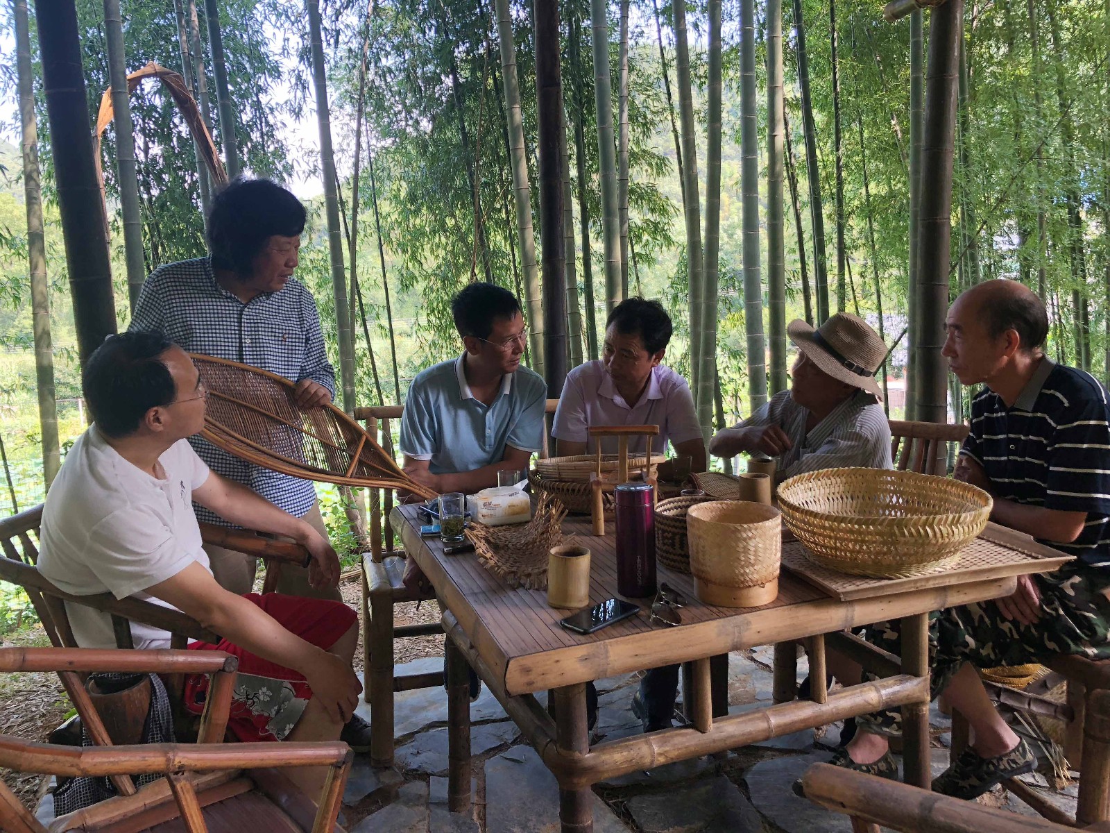 11-12日,林樂成一行還在石角村植物纖維工坊與溪口鎮(zhèn)的竹編工匠藝人進行了現(xiàn)場竹制品制作工藝交流,探討怎樣實現(xiàn)工藝品的日用化和日用品的工藝化,交流活動輕松愉快,一張照片圖案,經(jīng)過工匠藝人的手就能變成可觸摸的制品,感覺非常奇妙!10日一早,集團公司、工藝品公司消薄工作組和林樂成一行冒著“利奇馬”帶來的大風大雨,趕到省二輕集團下屬工藝品公司幫扶結(jié)對的寺下村,深入調(diào)查研究,實地了解竹編廠生產(chǎn)經(jīng)營和產(chǎn)品市場境況,與鎮(zhèn)、村委班子成員進行了現(xiàn)場交流。